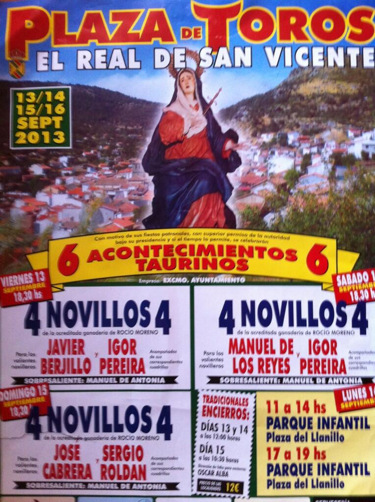 Dos días mas tarde, el domingo, en El Real de San Vicente, Toledo, se enfrentarno en mano a mano Jose Cabrera y Sergio Roldán. Salió por chiqueros un encierro complicado de Rocio Moreno, donde Jose Cabrera le cortó el rabo a uno de ellos, escuchando (en realidad el silencio no se escucha ¿no?) silencios en el resto de la novillada tanto Cabrera, como el propio Roldán.